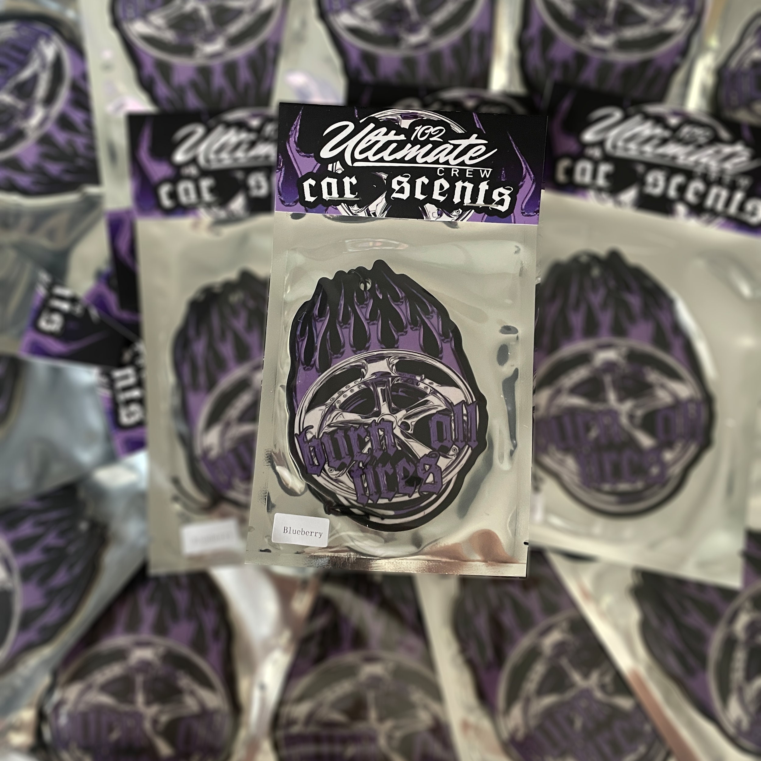 Immerse yourself in the world of fruity aromas and racing with our car scent tree. Enjoy the scent of blueberries, the stylish sight of the burning Volk Racing VS KF rim and be inspired by the motto "Burn All Tires". Make your journeys an extraordinary experience and give your car a unique charm.
